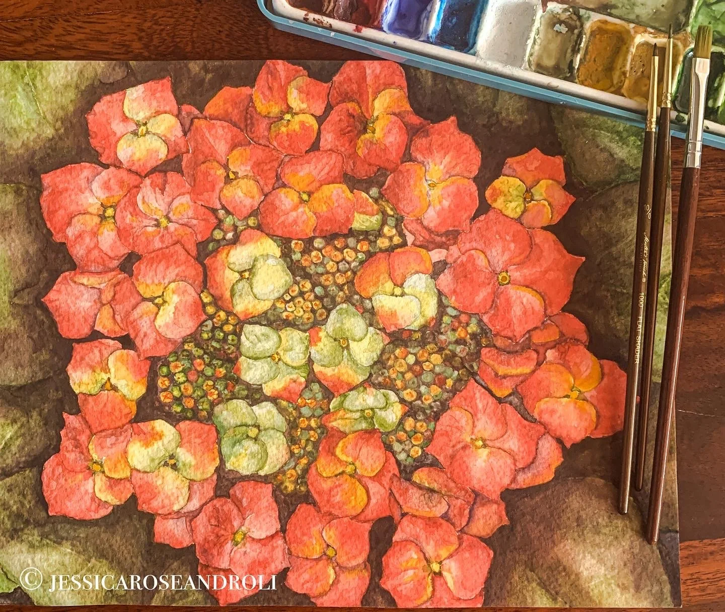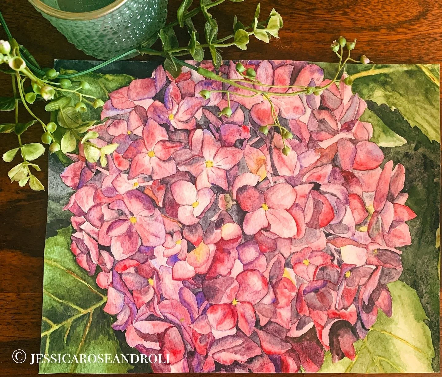 Coral Hydrangea. Watercolor on paper.